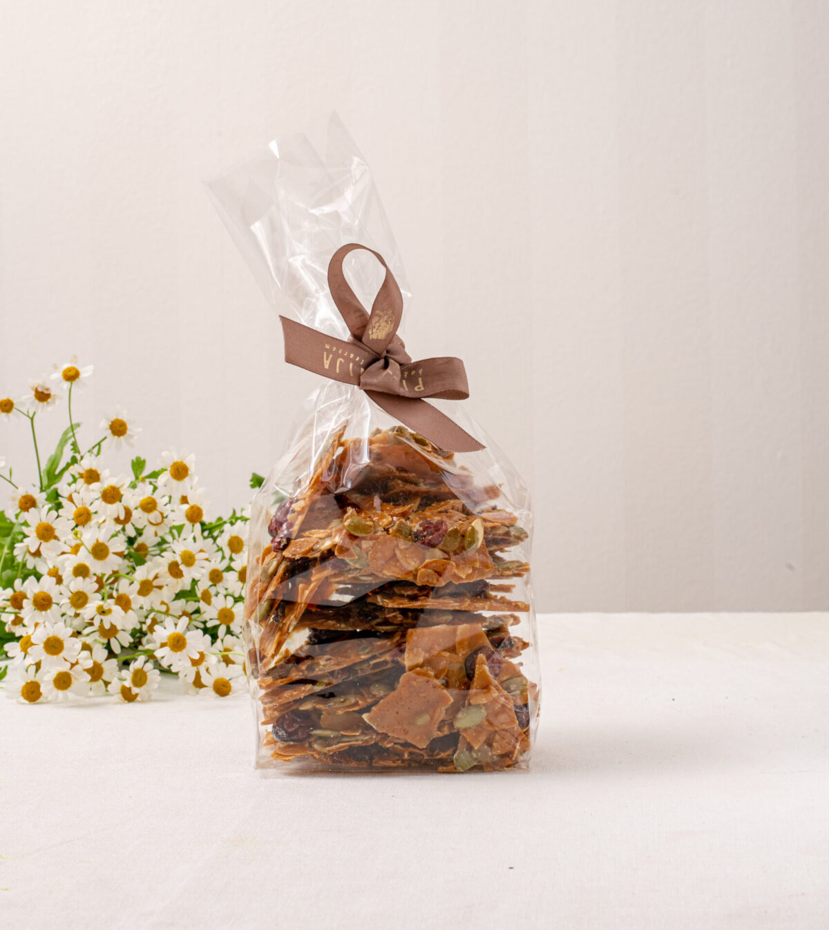 Traškūs sausainėliai su karamelės ir medaus prieskoniu, pagardinti moliūgų sėklomis, džiovintomis spanguolėmis ir migdolų riekelėmis. Supakuota pakuotėse po ~250g