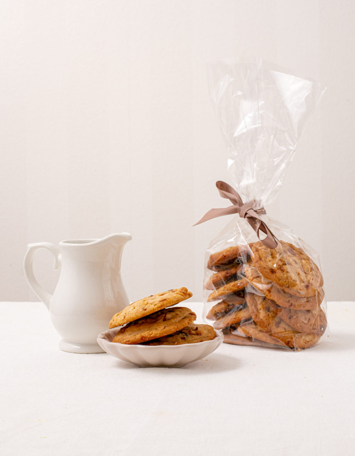 Traškūs sausainiai su šokolado gabalėliais, griliažu ir migdolais. Supakuota pakuotėse po ~ 250 g.