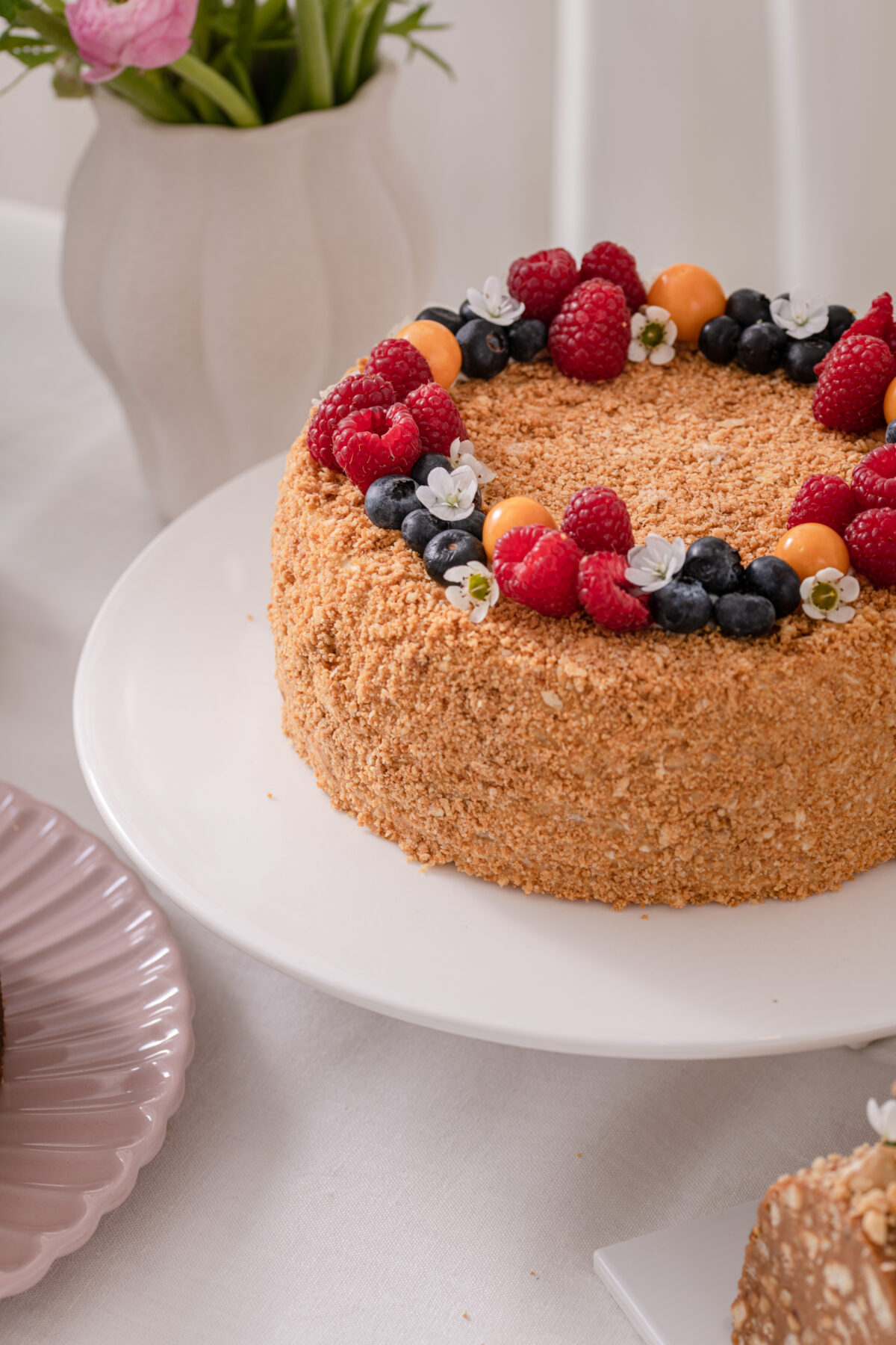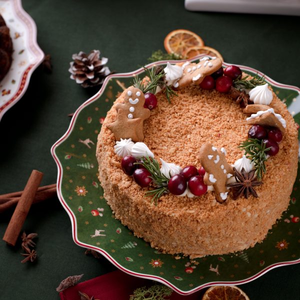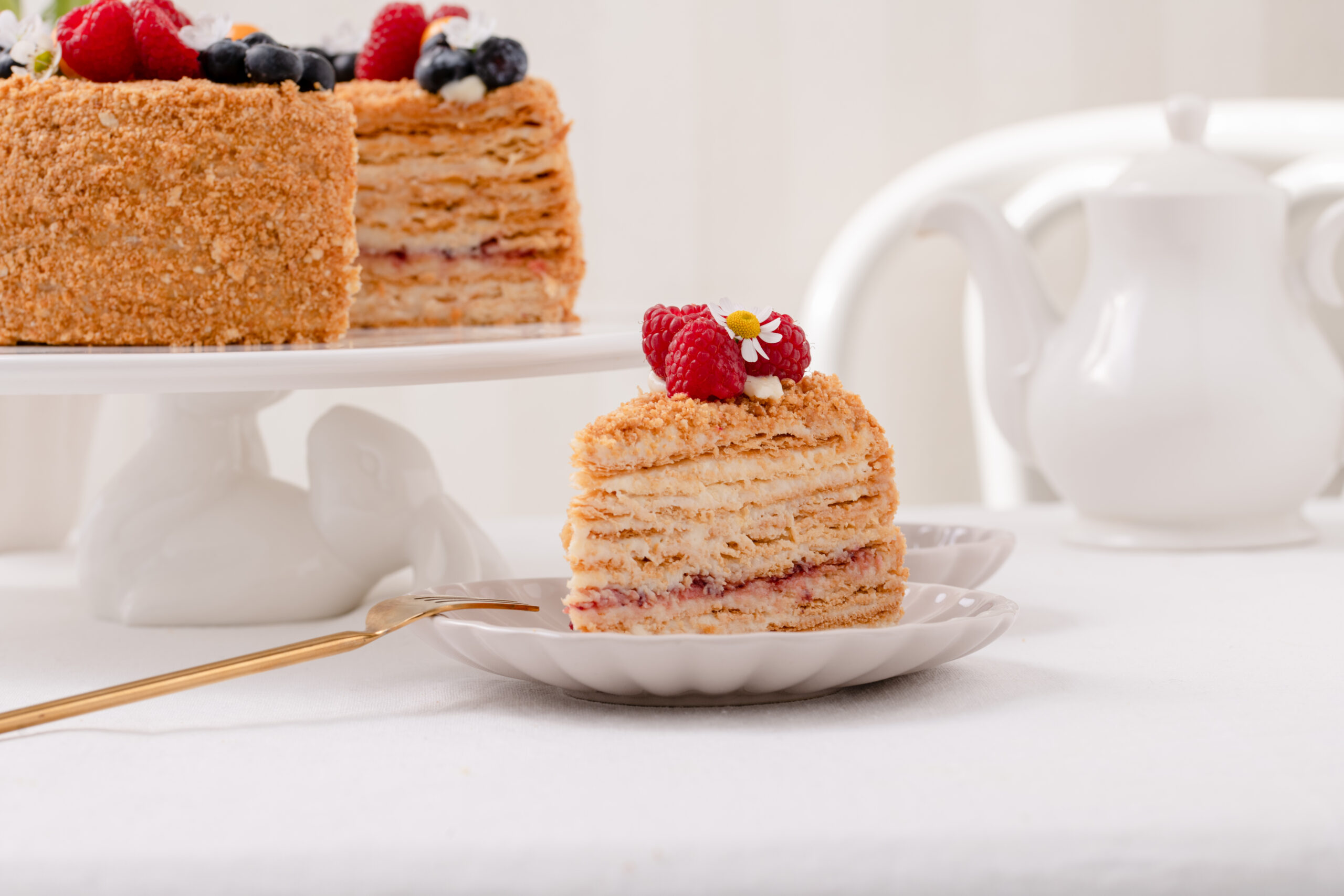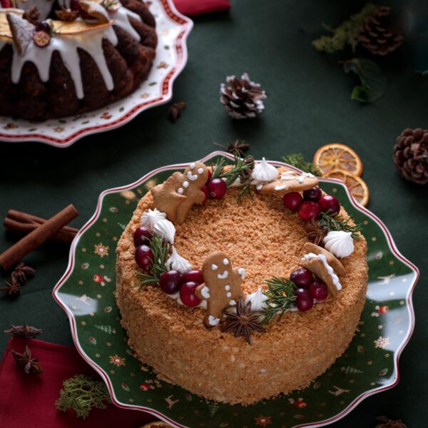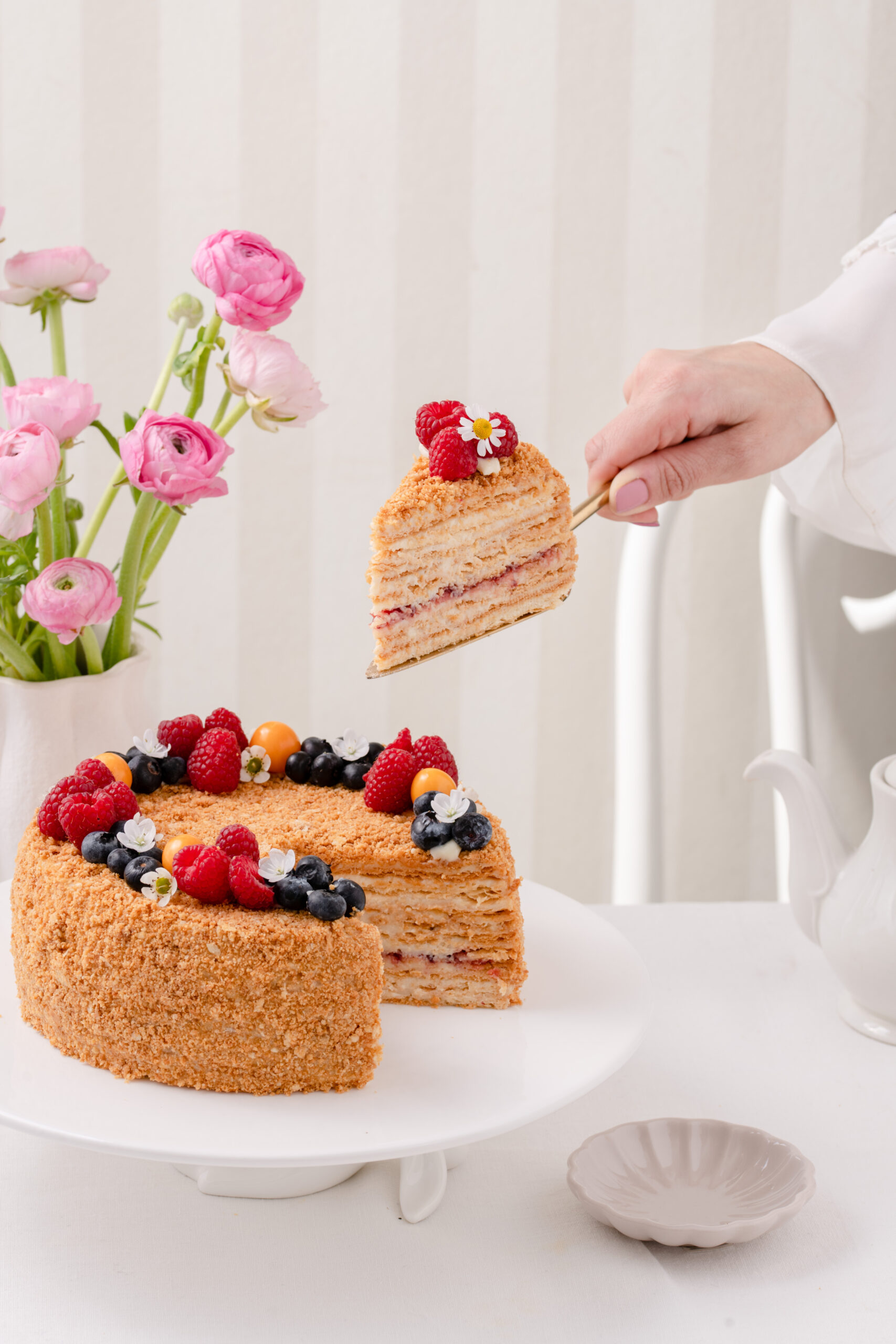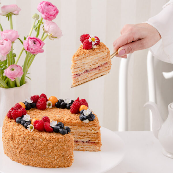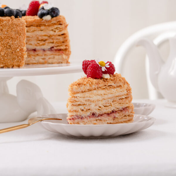 Kepamas pagal seną autentišką receptą – rankomis kapotos tešlos lakštai, pertepti smetonišku sviestu, pagardintas prancūzišku konjaku ir šviežiomis trintomis uogomis.