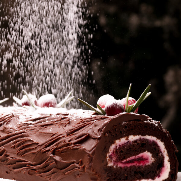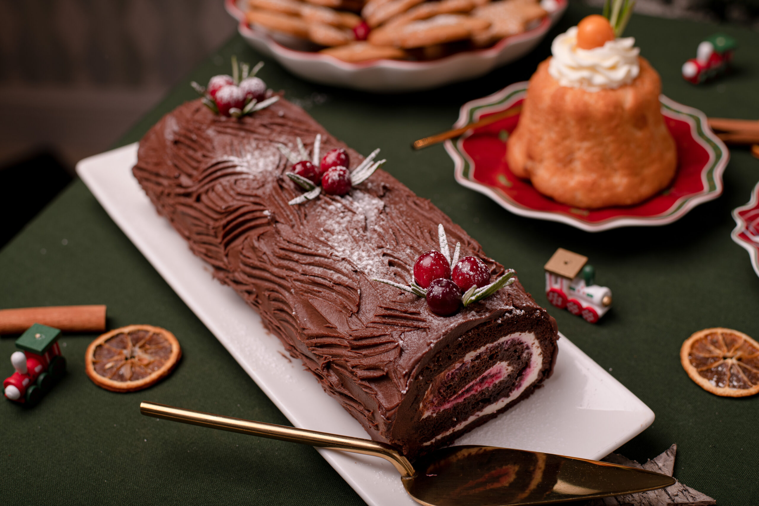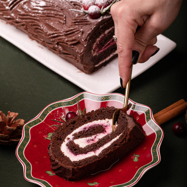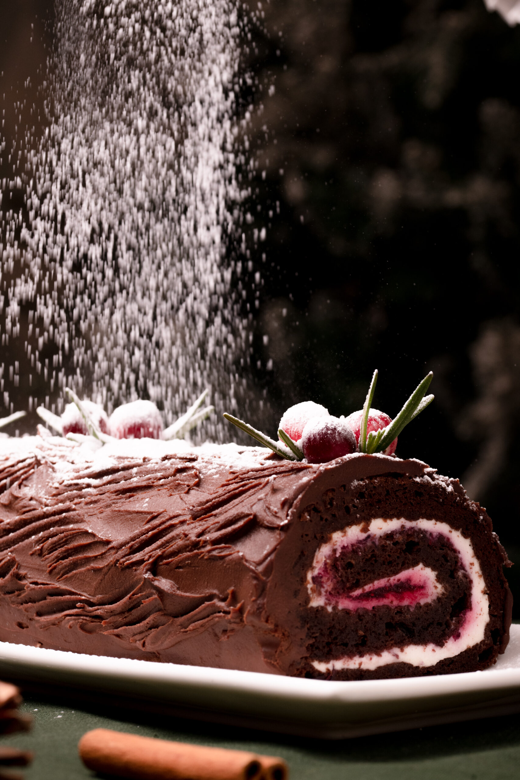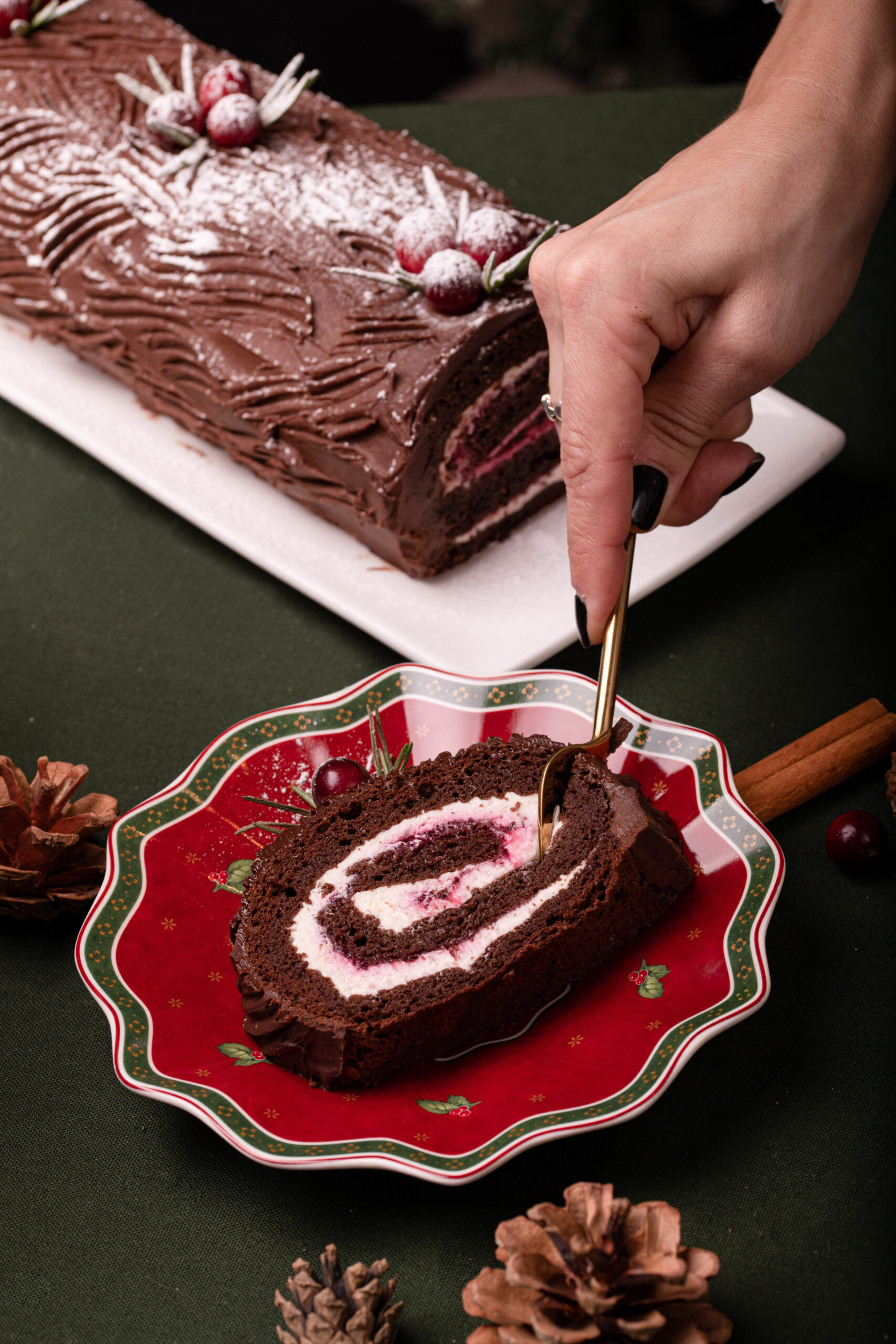 Minkšto šokoladinio biskvito, švelnios maskarponės ir spanguolių Kalėdinis vyniotinis.