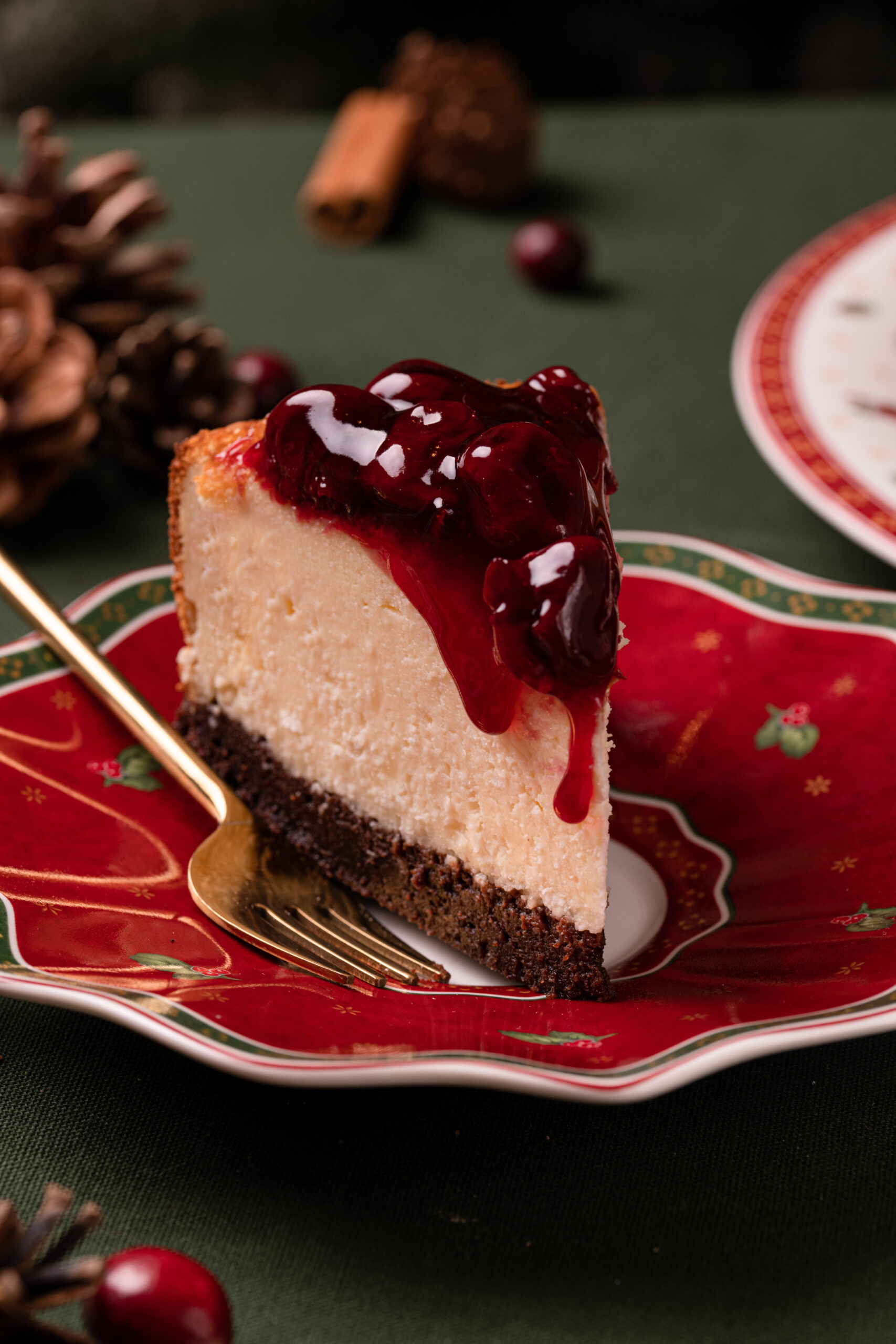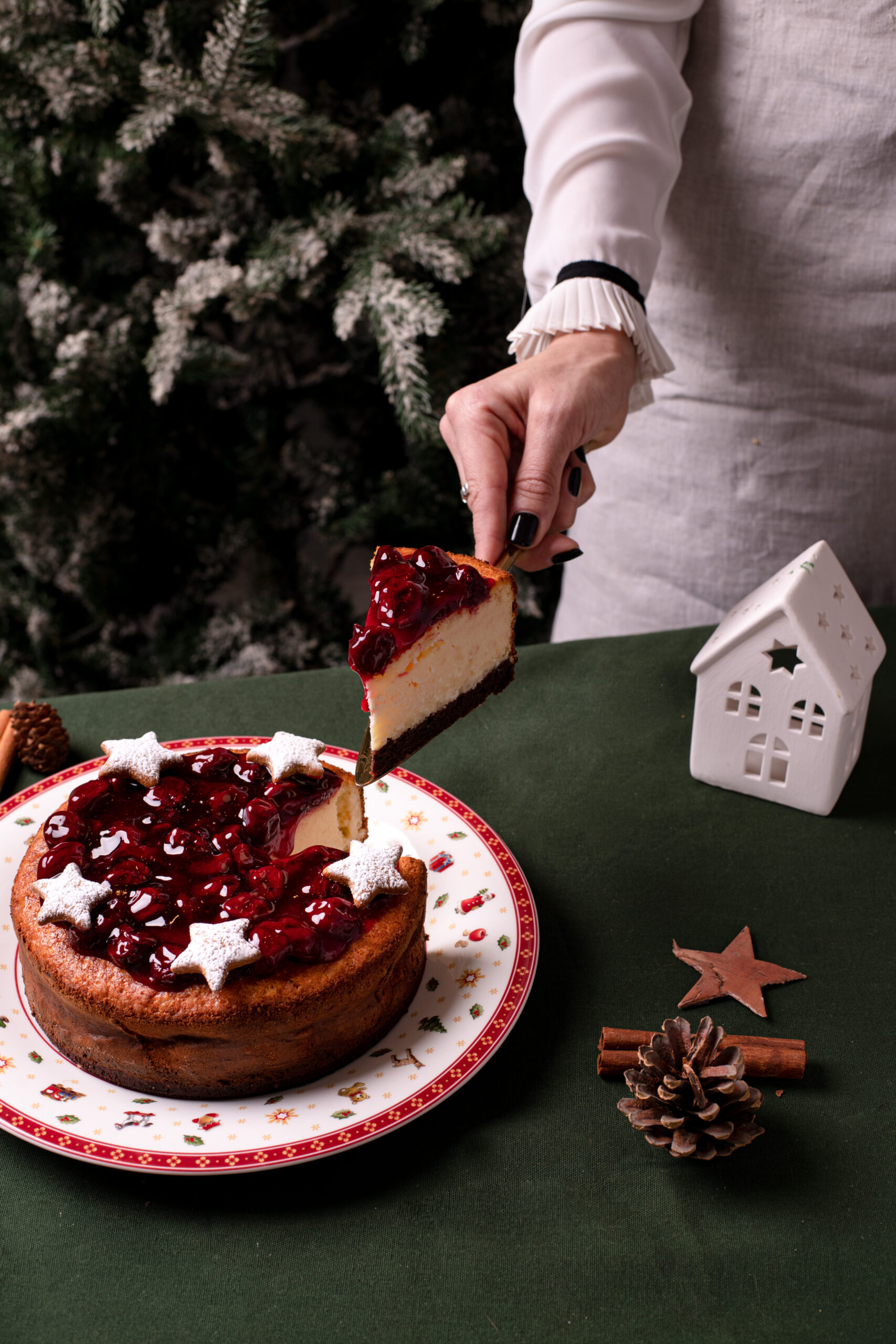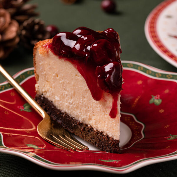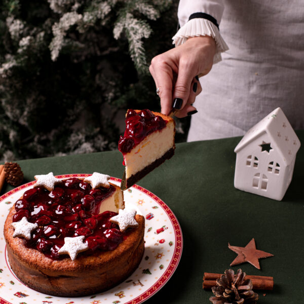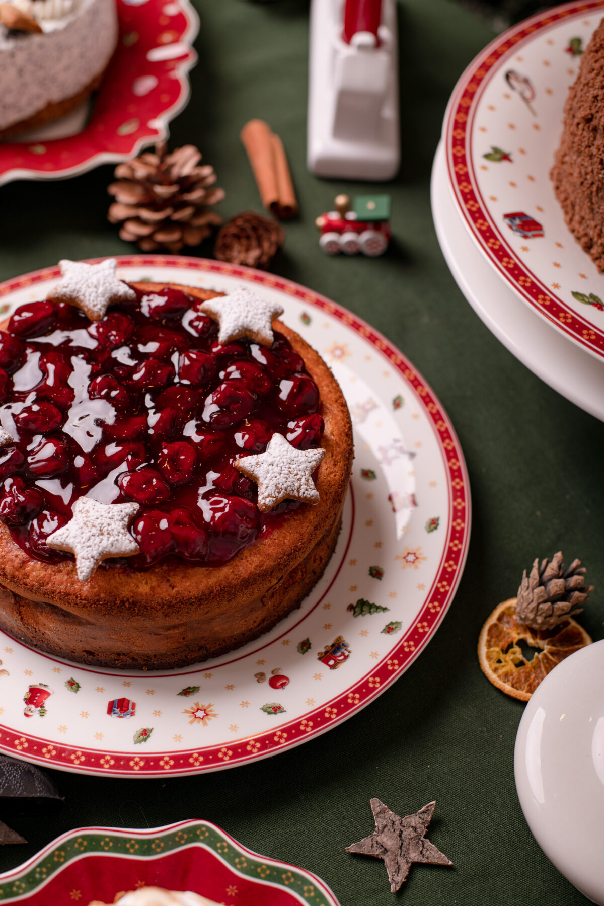 Kreminis varškės pyragas pagardintas namine vyšnių uogiene.